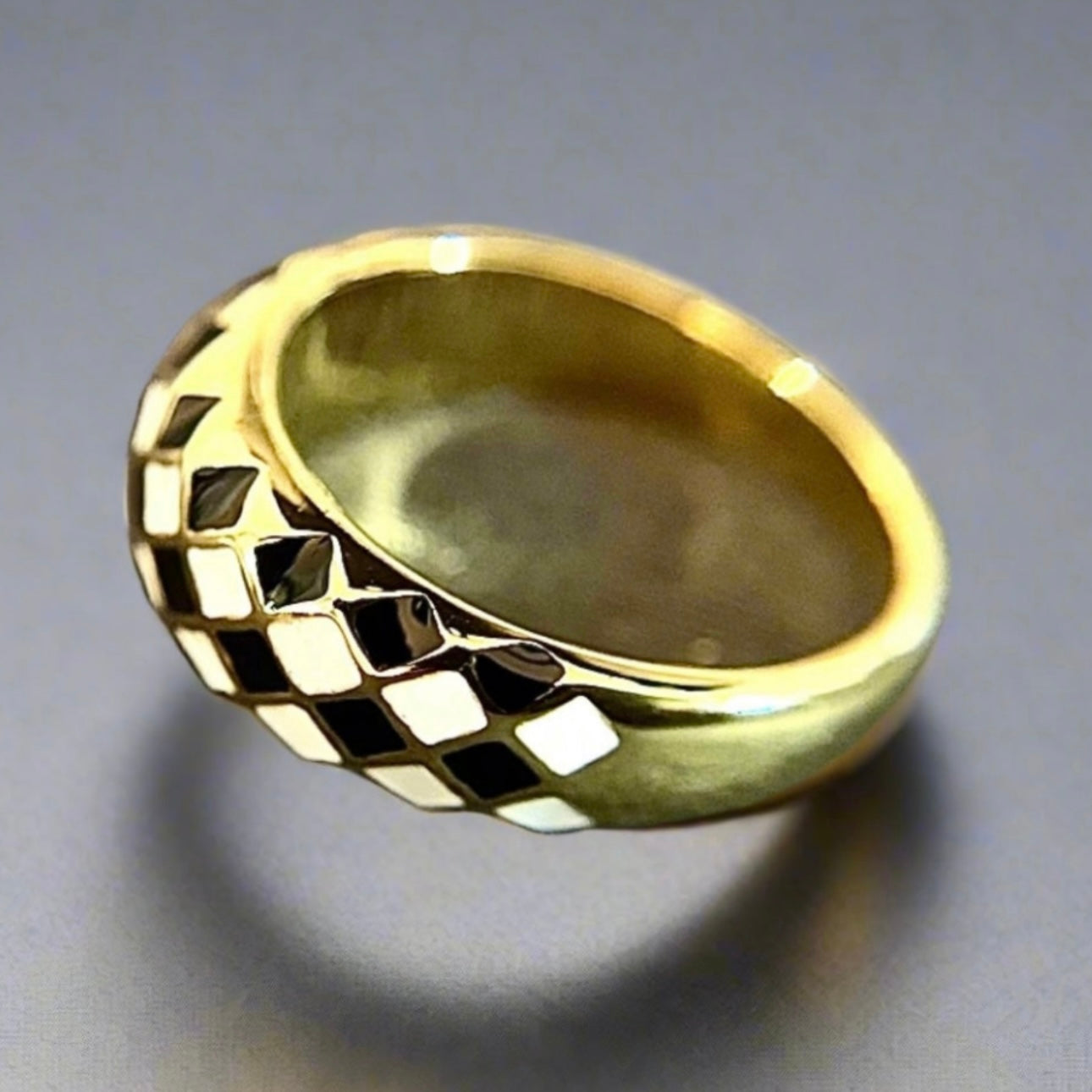 Make an impression with this fun and classic checker pattern ring. Black and white never goes out of style.