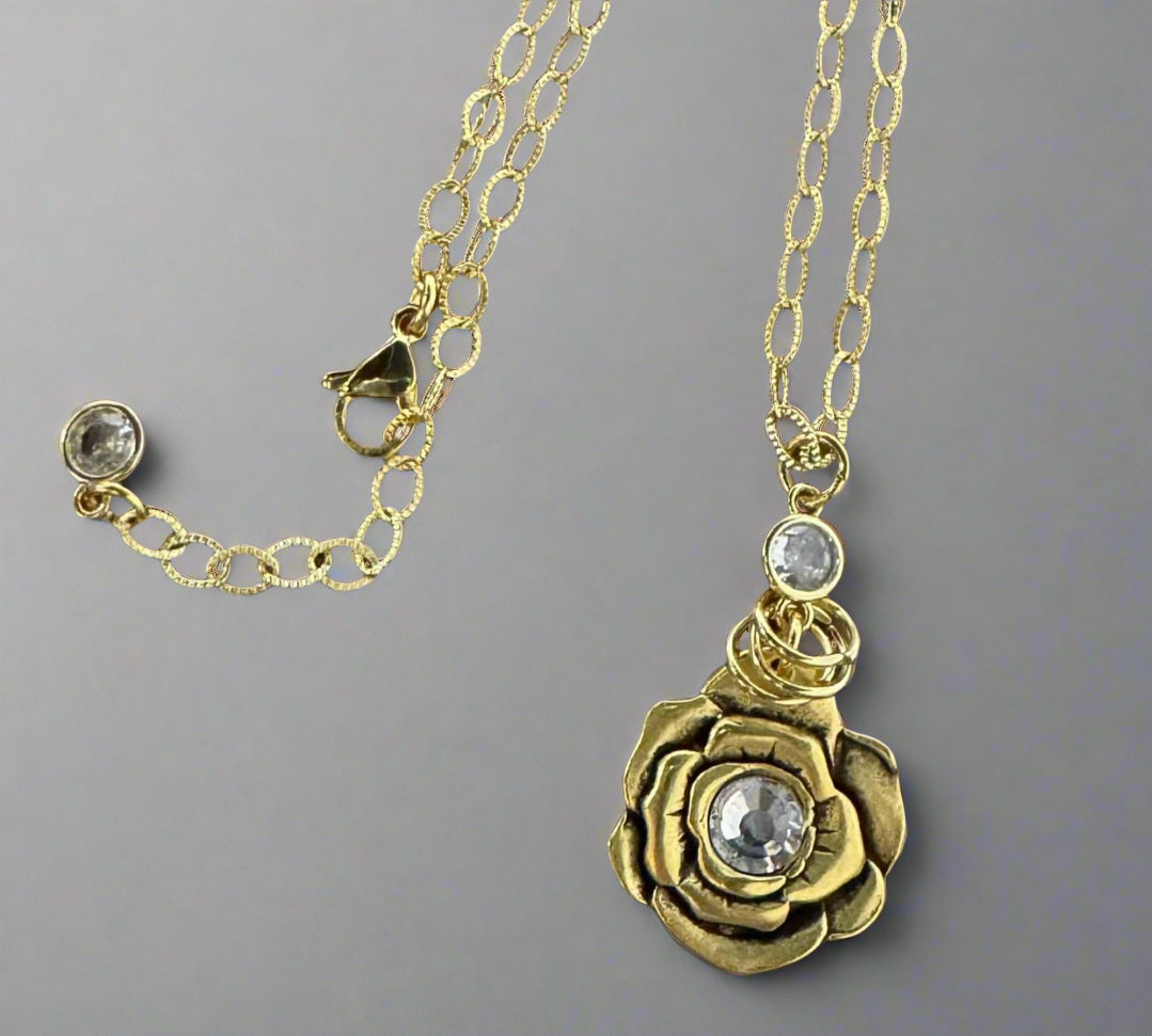 Featuring a hand - casted rose with a shiny Swarovski center. Favorable piece for neck stack or worn alone.