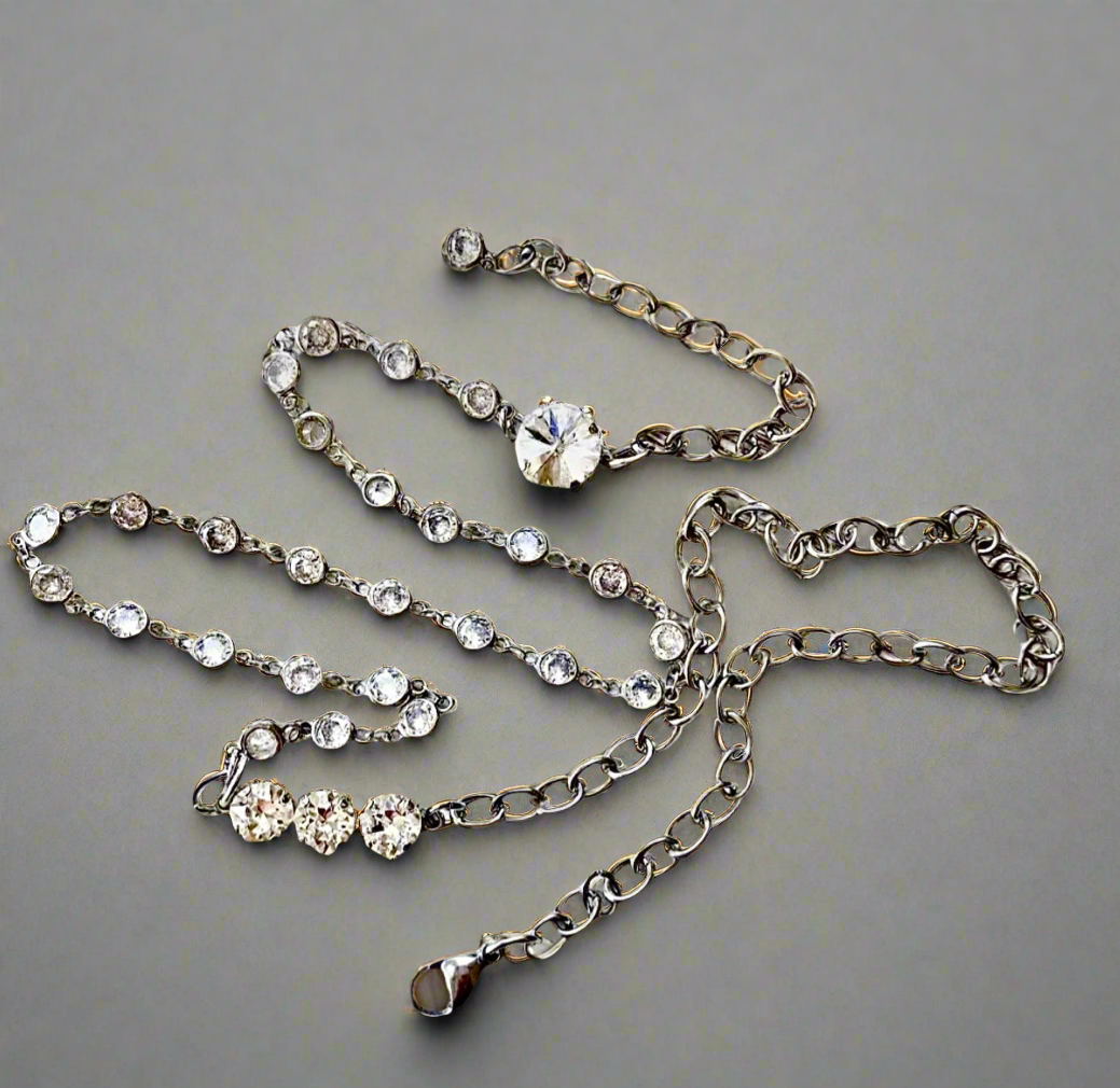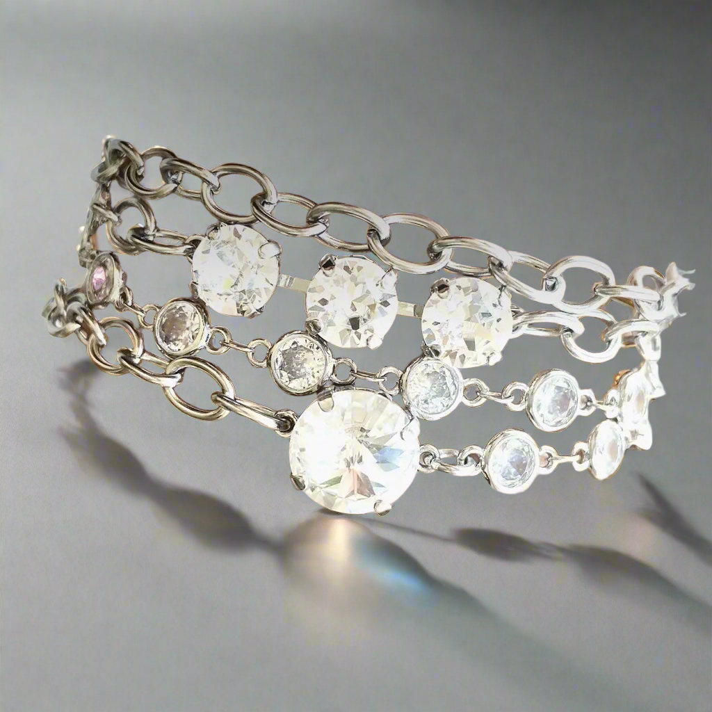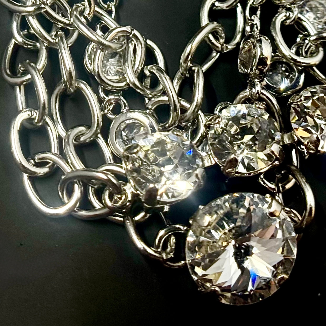 Adjustable stainless steel arm party for one wraps around 4 times and is adorned with different sized sparkly Swarovski crystals. Great one piece can also be worn as necklace.