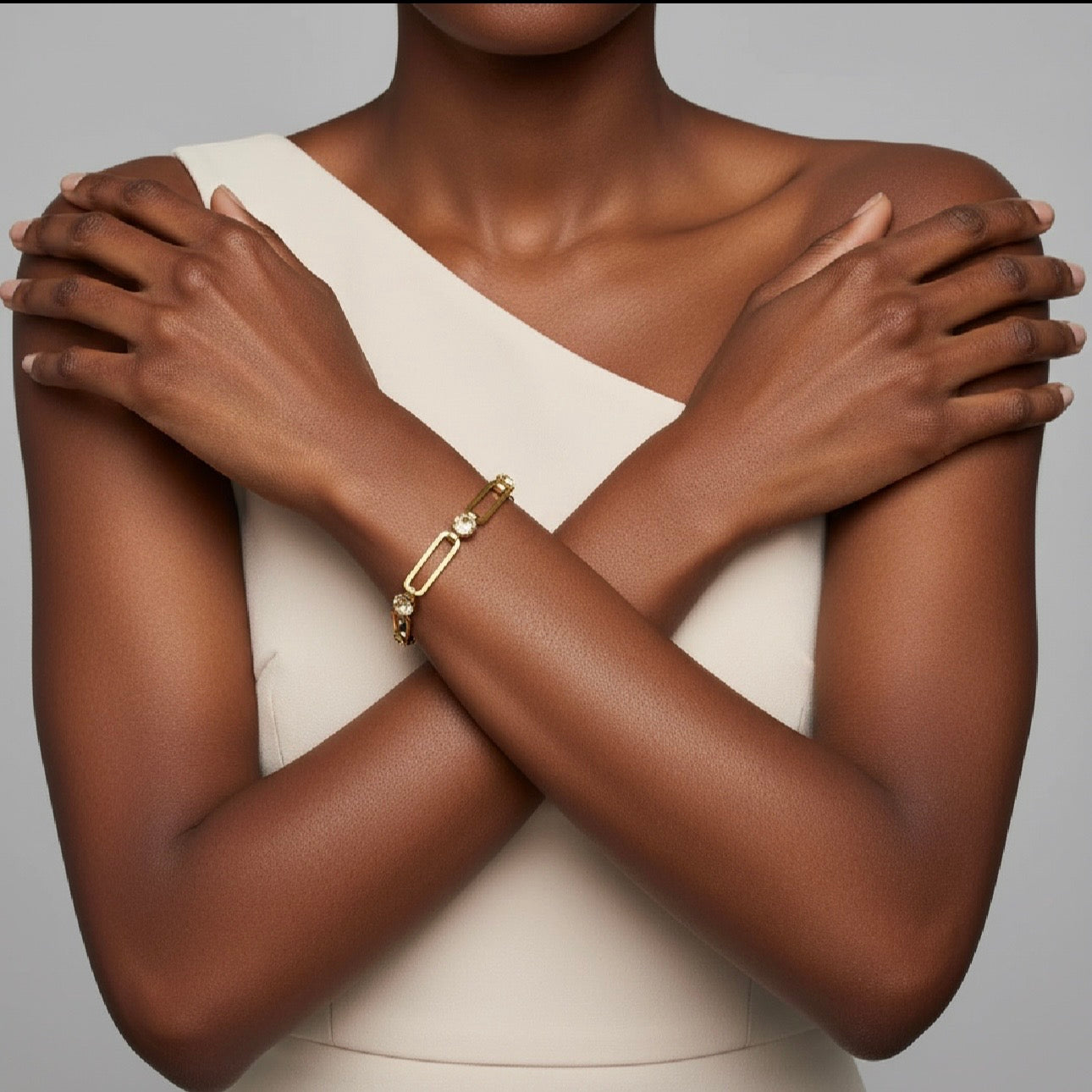 By mid 20th century the paperclip trend was seen in fine and fashion jewelry believing to symbolize, peace and unity. This particular eye-catching piece includes shiny crystals between each elongated link giving a timeless appeal.