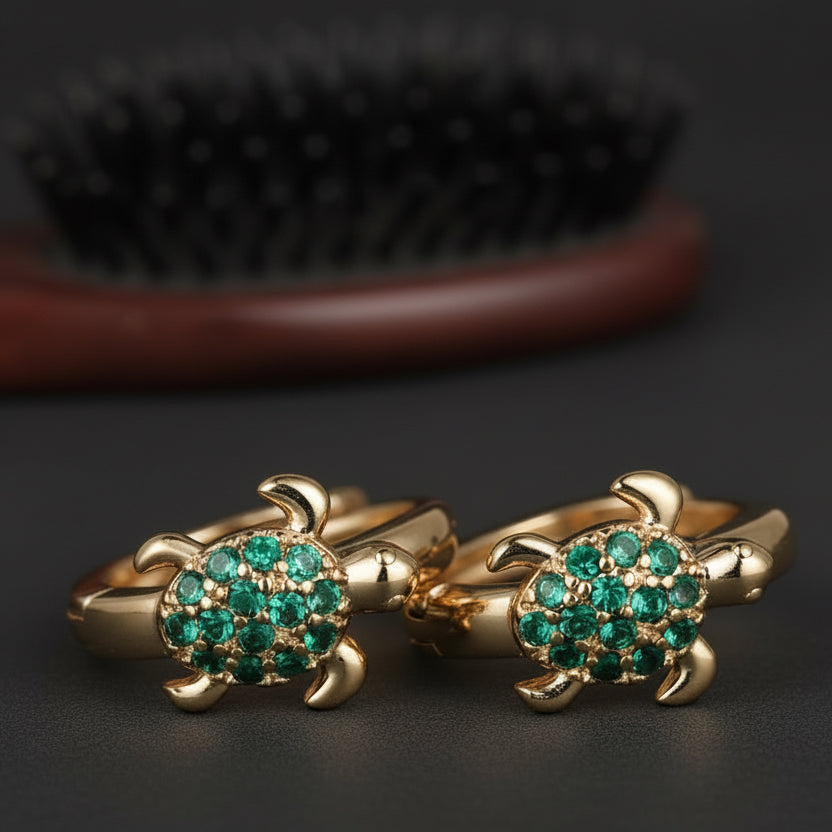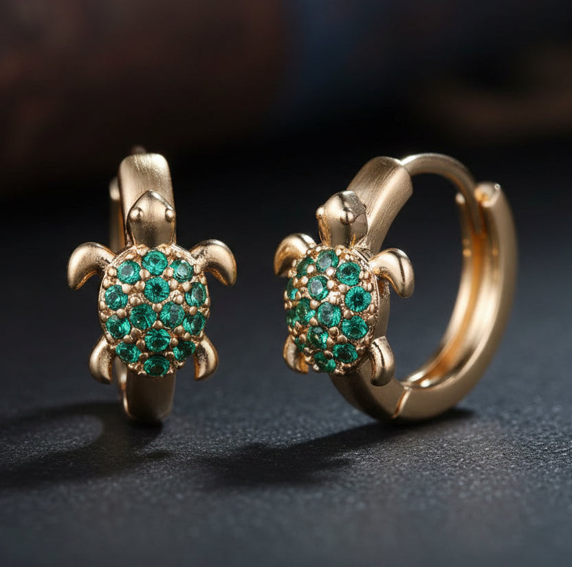 Elevate your earstack with our favorite 11mm Green Turtle Huggies. Small, snug and sparkling, these Huggies feature a detailed turtle with vibrant green stone detailing, designed to “hug” your earlobe.